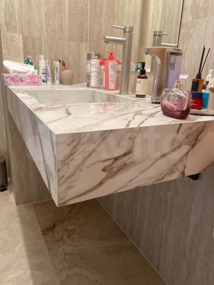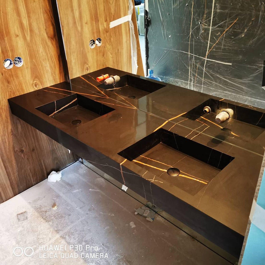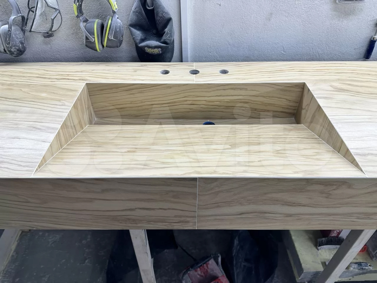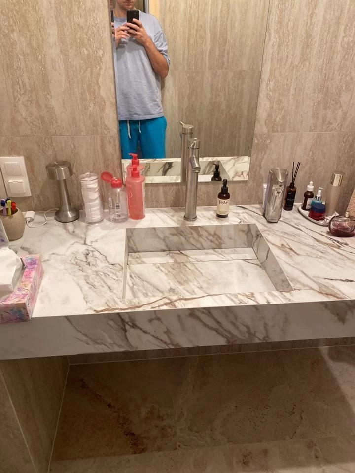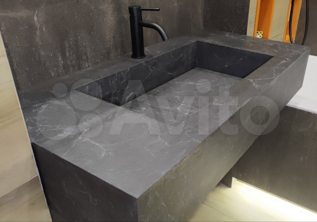 Нет, швы практически незаметны. Мы используем технологию запиловки краев под 45 градусов. Детали склеиваются специальным двухкомпонентным составом (эпоксидной смолой), который мы колеруем точно в цвет прожилок и фона камня. После финальной шлифовки и полировки стык выглядит как единый монолитный блок, он абсолютно герметичен и не ощущается тактильно.